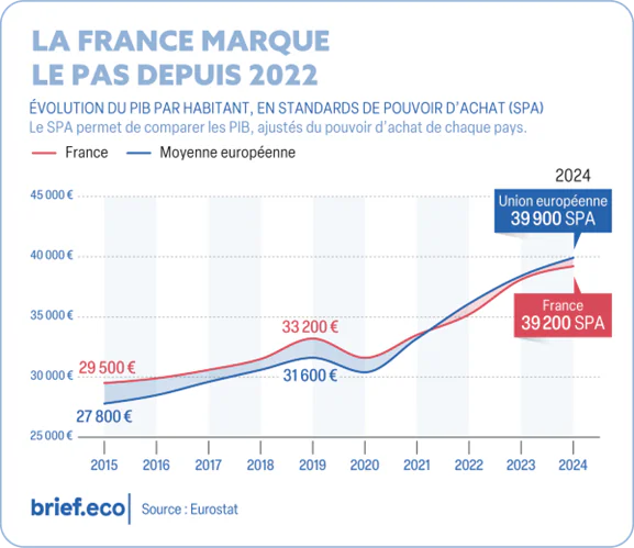 Depuis 2022, le PIB par habitant de la France se situe sous la moyenne de celui de l’UE. Mais que signifie réellement ce chiffre et faut-il s’en inquiéter ? Quel PIB par habitant dans l’UE ? En 2024, le PIB par habitant de la France s’élevait à 39 200 en standard de pouvoir d’achat (SPA), selon des données provisoires de l’institut européen de statistiques Eurostat. Ce chiffre place le pays au 12e rang de l’UE. La moyenne européenne se situait légèrement au-dessus, à 39 900 SPA.